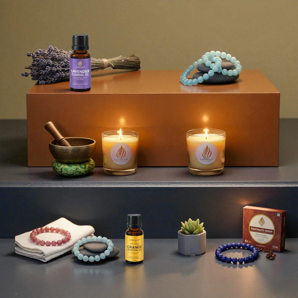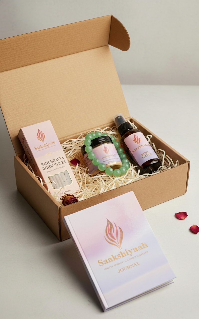 Elevate your self-care ritual with our marquee Meditation Kit. We've brought together everything you need to find your center and restore your balance. This kit includes our exclusive Saakshiyaah Journal, powerful aura-enhancing bracelets, and invigorating rose water to awaken your spirit. Complement your practice with fragrant, organic dhoop sticks designed to create a tranquil atmosphere. We are dedicated to nurturing the mind-body connection through our thoughtfully curated wellness offerings