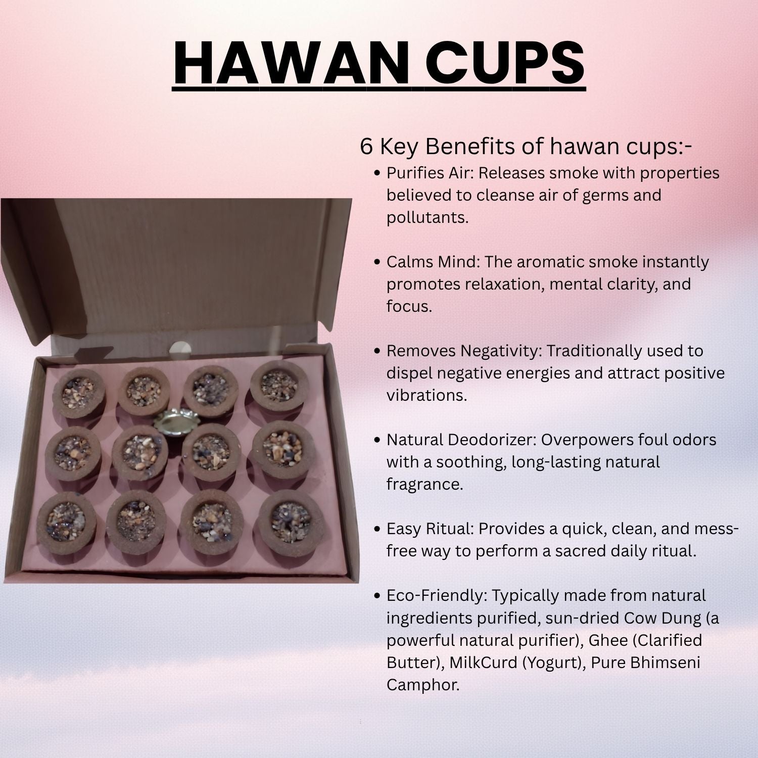The Divine Core (The Offering): Nestled within each Panchagavya cup is a potent, aromatic offering of traditional havan samagri. This divine blend includes pure, natural resins like Sambrani (Gum Benzoin) and Guggul, mixed with rare medicinal herbs and sacred wood powders.
